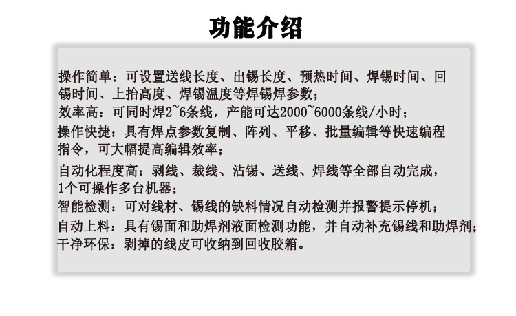 適用范圍:PCB板自動(dòng)裁線焊線機(jī),適用于各種PCB板、燈板、燈條、電子元件、開關(guān)、馬達(dá)、三極管LED燈等產(chǎn)品的焊線.